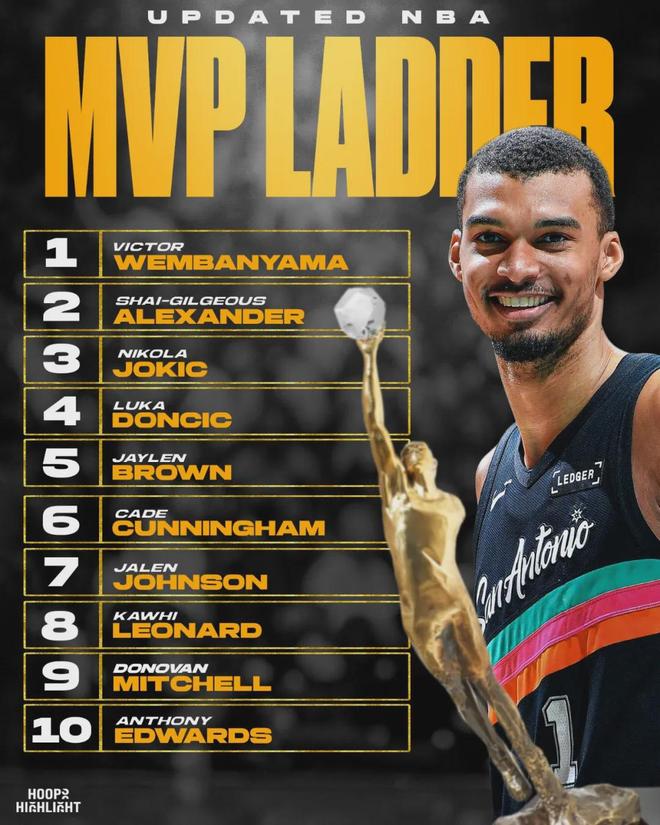 文班目前是MVP榜第一,东契奇仅排第四。文班本赛季场均24.2分11.3板3助1.1断3.1帽2.5失误,三项命中率:50.1%,34.8%,82%。东契奇场均33.7分7.8板8.2助1.6断0.5帽4失误,三项命中率:47.6%,36.6%,77.6%。