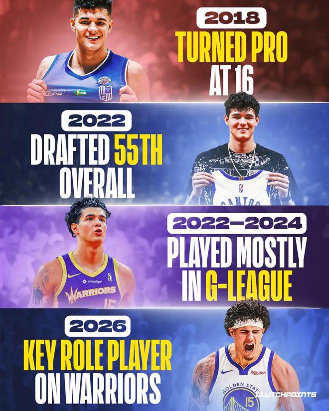 桑托斯身高2米01,臂展2米13,拥有不错的锋线体型。他是2022届的55顺位,这个顺位的球员,很多连真正踏上NBA赛场都不到,但桑托斯,现在已经完全成长为勇士的主力轮换,甚至是未来之一。